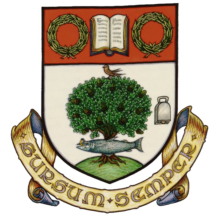 Blazon: Argent, on a mount in base an oak tree, the stem at the base surmounted of a salmon on its back with a signet ring in its mouth, on the top of the tree a redbreast and in the sinister fess point an ancient handbell proper, on a chief Gules an open book also proper leaved Or between two wreaths of laurel Gold.